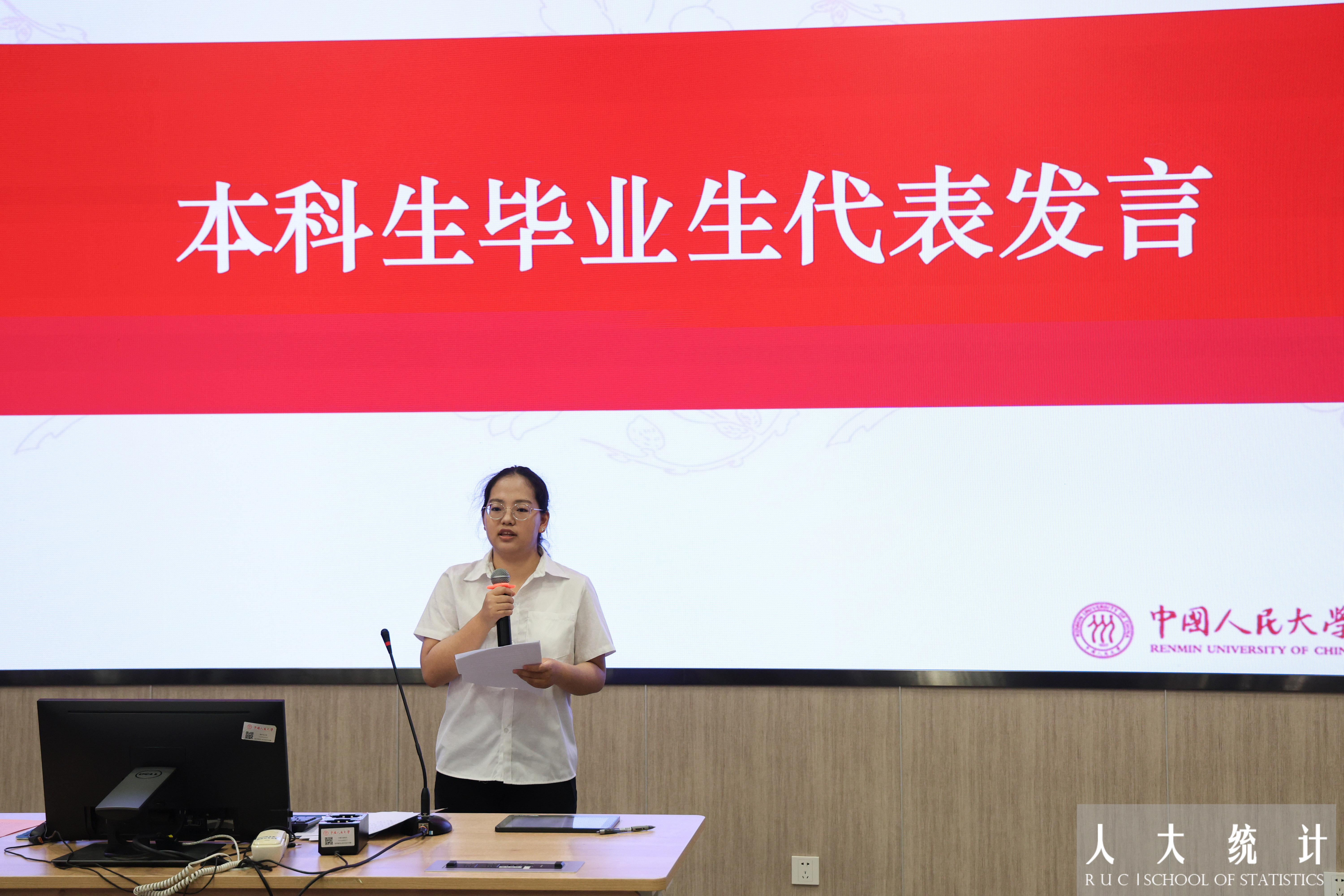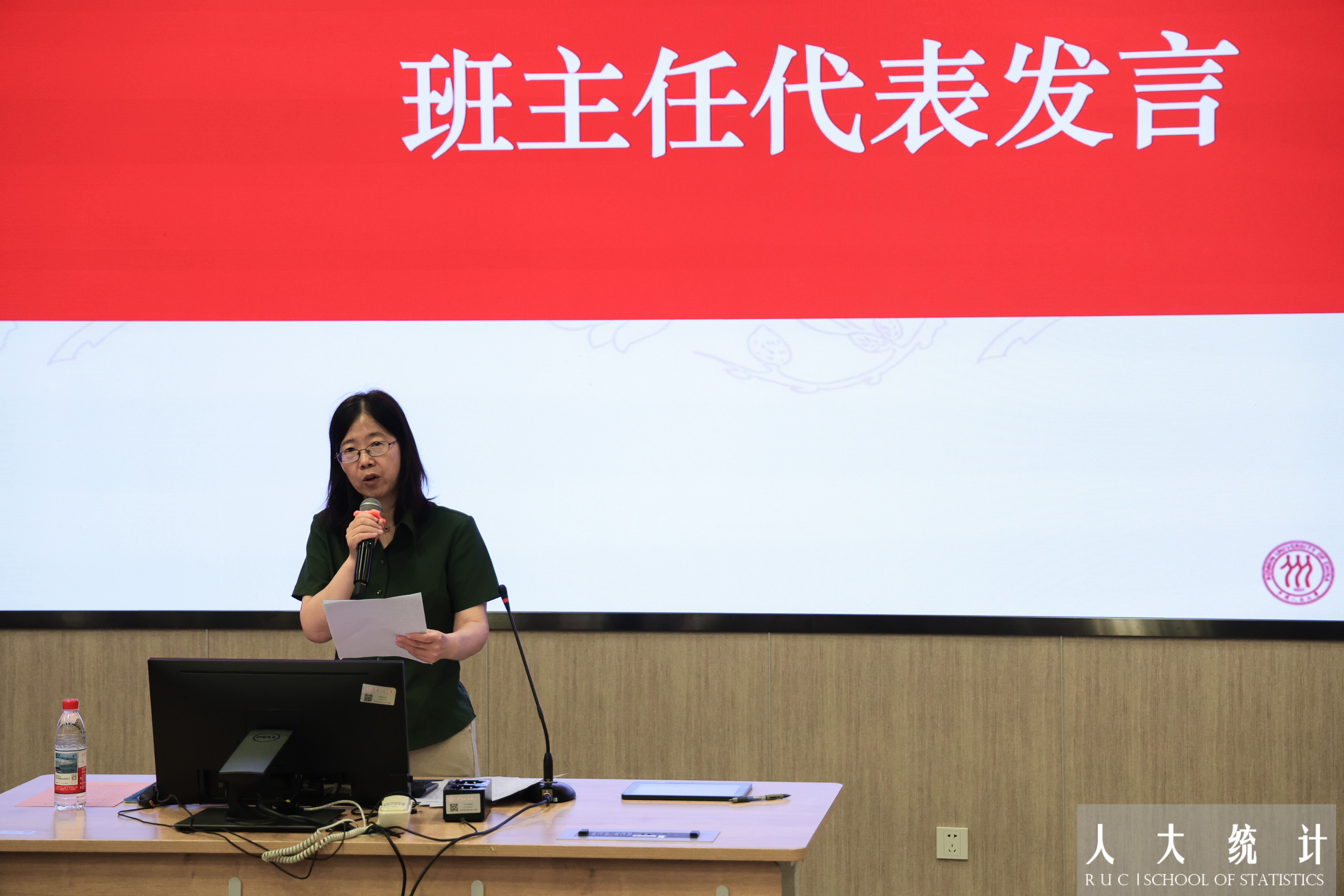 2021级本科1班班主任许王莉回忆了与同学们朝夕相处的点滴时光和温暖瞬间。她寄语全体毕业生,要闪耀独特光芒,把握新的开始;要秉持终身学习的理念,保持求知若渴的初心;要坚持以诚信为本,做值得信赖的人大统计人;要永葆谦虚品格,成功时懂得感恩,挫折时保持韧性,在更广阔的天地里书写人生篇章。