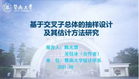 5月21日下午,“统计大讲堂”系列讲座第154讲举行。本次讲座采取在线会议的方式,邀请暨南大学经济公司统计学系陈光慧教授作题为“基于交叉子总体的抽样设计及其估计方法研究”的报告。yl6809永利李扬教授参加本次讲座,讲座由yl6809永利蒋妍副教授主持。